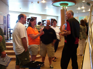 After the Toby Mac concert, we headed up to the Viking Crown Lounge, a piano lounge with a 360 degree view of the ocean at the top of the ship. Bruce & I started performing magic for the people already there, and we continued on for almost 2.5 hours, as people came and went the entire time. There were about 8 people that stayed the entire time, and later referred to themselves as our "groupies". It was very fun, as we tag-teamed back and forth doing routine after routine, trying out new stuff and throwing in the good old stand-bys when needed.